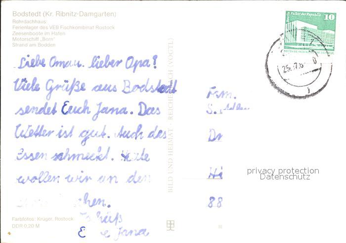 72334096 alte Postkarte Bodstedt Rohrdachhaus Ferienlager Zeesenboote Hafen Motorschiff Strand Bodden postalisch gelaufen Erhaltung siehe scans KatCode: 11110013057029