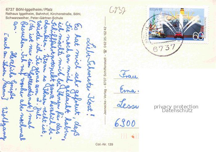 74042371 alte Postkarte Boehl-Iggelheim Pfalz Rathaus Bahnhof Kirchenstrasse Schwarzweiher Peter Gaertner Schule postalisch gelaufen Erhaltung siehe scans [WerneD78] KatCode: 11110007338005