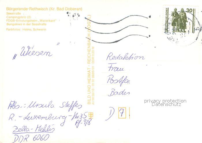 73652204 alte Postkarte Boergerende-Rethwisch Seestrasse Campingplatz FDGB Erholungsheim Waterkant Bungalows Seestrasse postalisch gelaufen Erhaltung siehe scans [WerneD78] KatCode: 11110013051013