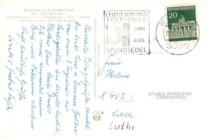 73722342 alte Postkarte Boeseneck Gasthaus zum oelschnitztal Fernsehturm am Ochsenkopf Ortsansicht oelschnitztal Gefrees postalisch gelaufen Erhaltung siehe scans [WerneD78] KatCode: 11110009472139