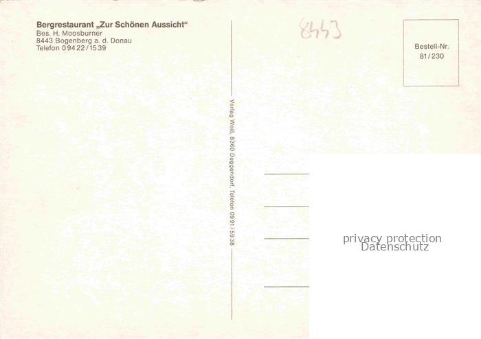 74049272 Bogenberg Niederbayern Bergrestaurant Zur schoenen Aussicht Terrasse Fernsicht Donau postalisch nicht gelaufen Erhaltung siehe scans [FriedD77] KatCode: 11110009278118