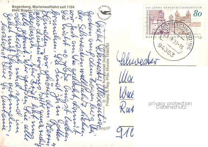 72687242 alte Postkarte Bogenberg Niederbayern Donaupartie Marien Wallfahrtskirche Fliegeraufnahme postalisch gelaufen Erhaltung siehe scans [WerneD78] KatCode: 11110009278118