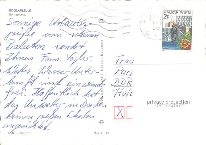 old postcard Boglarlelle Balatonlelle Kirche Hotel Restaurant Strand Kinderspielplatz Skulptur postalisch gelaufen Erhaltung siehe scans