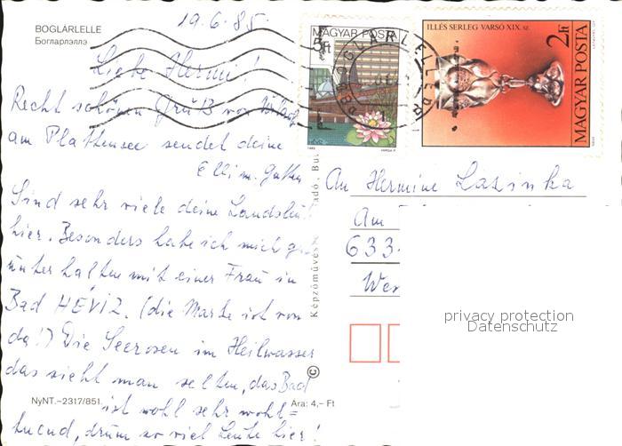 old postcard Boglarlelle Balatonlelle Restaurant Skulptur Segeln Plattensee Campingplatz Kirche postalisch gelaufen Erhaltung siehe scans