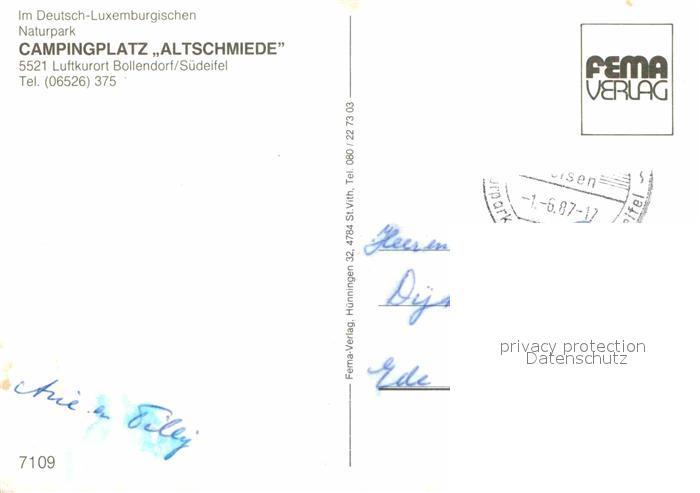 72916881 alte Postkarte Bollendorf Suedeifel Campingplatz Altschmiede Deutsch Luxemburgischer Naturpark postalisch gelaufen Erhaltung siehe scans [FriedD77] KatCode: 11110007232019