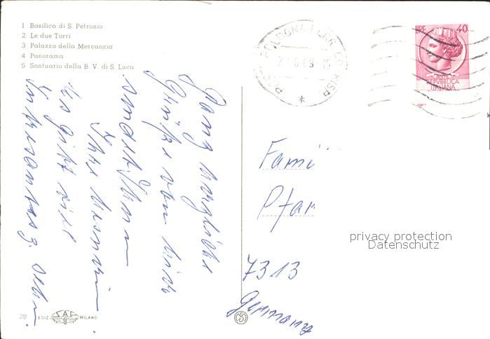 old postcard Bologna Basilika San Petronio Palazzo Mercanzia Panorama San Luca postalisch gelaufen Erhaltung siehe scans