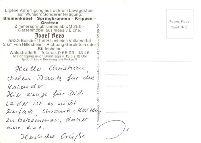 73882670 alte Postkarte Bolsdorf Blumenkuebel Springbrunnen Krippen Grotten Josef Kees postalisch gelaufen Erhaltung siehe scans [WerneD78] KatCode: 11110007233029