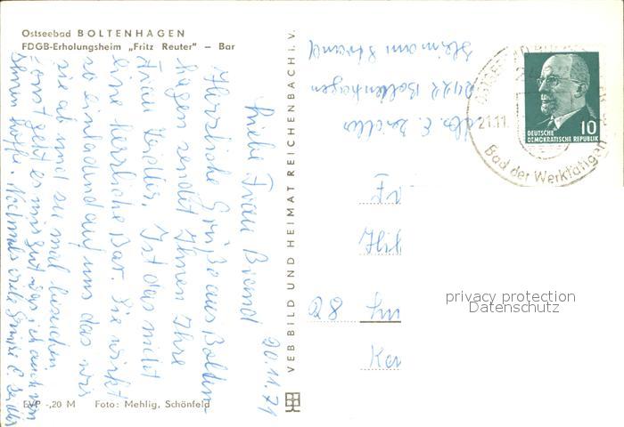 72056252 alte Postkarte Boltenhagen Ostseebad FDGB Erholungsheim Fritz Reuter Bar postalisch gelaufen Erhaltung siehe scans KatCode: 11110013058014