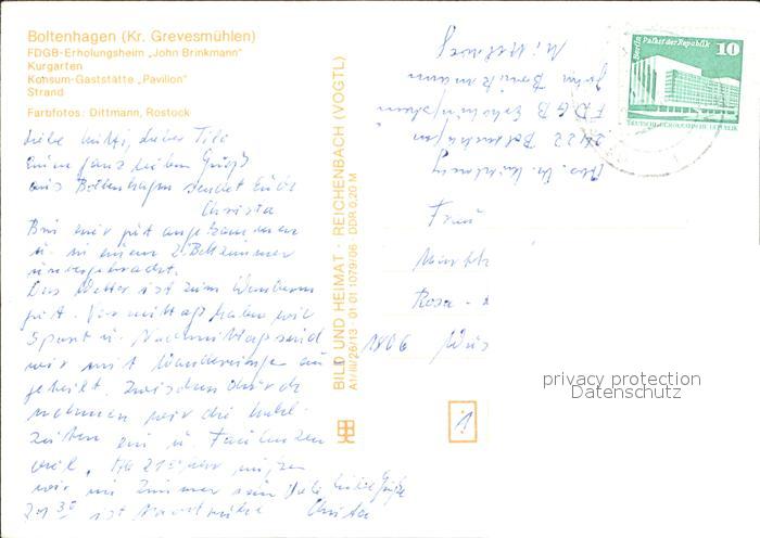 72458123 alte Postkarte Boltenhagen Ostseebad FDGB Erholungsheim John Brinkmann Kurgarten Konsum Gaststaette Pavillon Strand postalisch gelaufen Erhaltung siehe scans KatCode: 11110013058014
