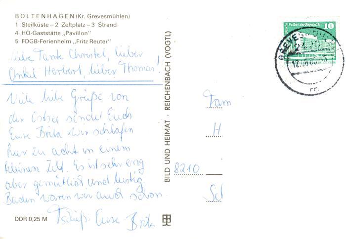 73893953 alte Postkarte Boltenhagen Ostseebad Steilkueste Zeltplatz Strand HOG Pavillon FDGB Ferienheim Fritz Reuter postalisch gelaufen Erhaltung siehe scans [FriedD77] KatCode: 11110013058014
