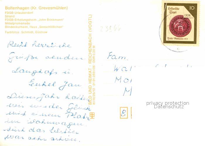 72917812 alte Postkarte Boltenhagen Ostseebad Strand Erholungsheim John Brinkmann Mittelpromenade Blindenkurheim Haus Seeschloesschen postalisch gelaufen Erhaltung siehe scans [LiesaD40] KatCode: 11110013058014