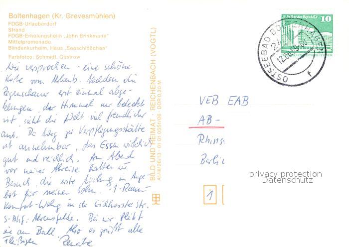 72953548 alte Postkarte Boltenhagen Ostseebad Strand FDGB Erholungsheim John Brinkmann Mittelpromenade Blindenkurheim Haus Seeschloesschen postalisch gelaufen Erhaltung siehe scans [WerneD78] KatCode: 11110013058014