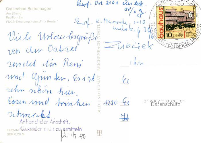72891176 alte Postkarte Boltenhagen Ostseebad Strandpartie Pavillon Bar FDGB Erholungsheim Fritz Reuter postalisch gelaufen Erhaltung siehe scans [WerneD78] KatCode: 11110013058014