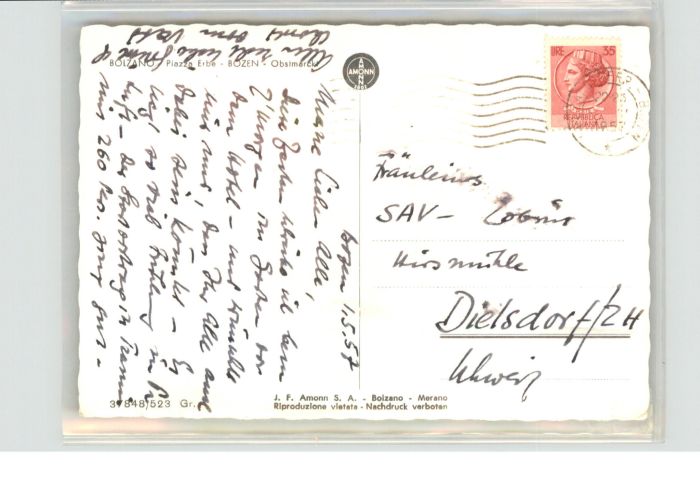 old postcard Bolzano Bozen Piazza Erbe Obstmarkt postalisch gelaufen
