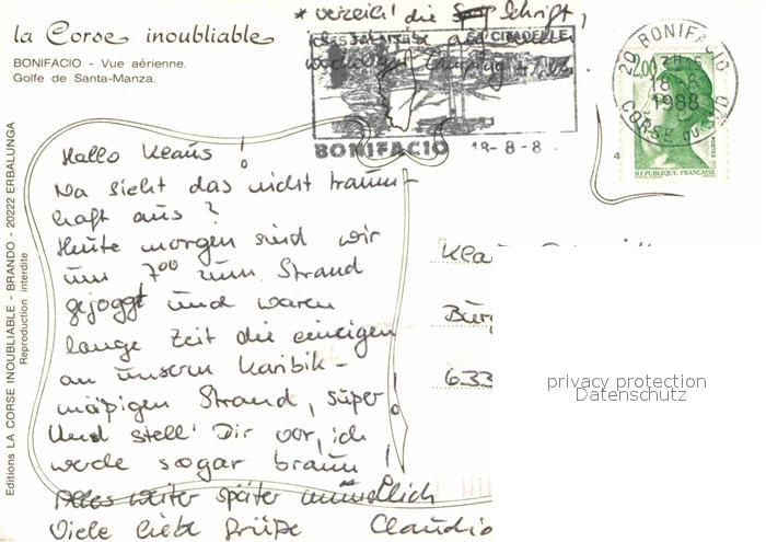 12868408 carte postale Bonifacio Corse du Sud Golfe de Santa Manza Fliegeraufnahme postalisch gelaufen Erhaltung siehe scans [WerneD78] KatCode: 1117002A42A041