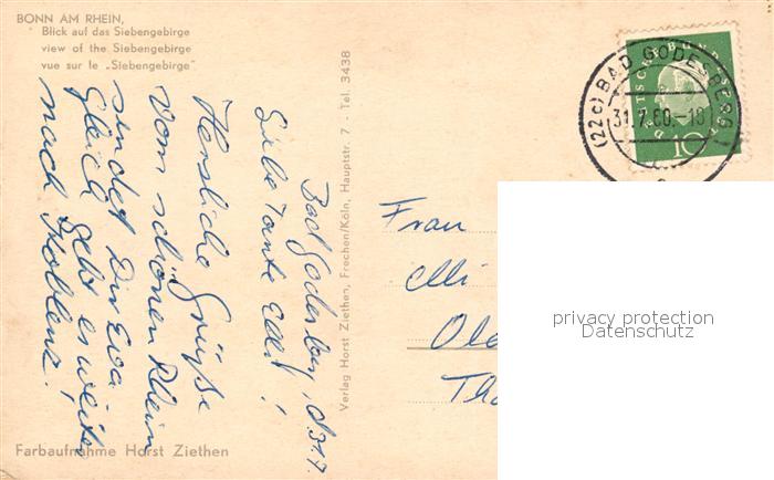 73040813 alte Postkarte Bonn Rhein Blick auf das Siebengebirge Bootsanleger Rheindampfer postalisch gelaufen Erhaltung siehe scans [FriedD77] KatCode: 11110005314000
