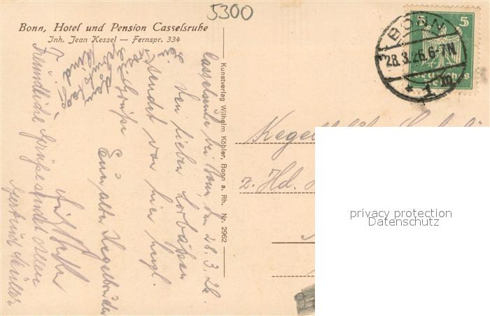 73706079 alte Postkarte Bonn Rhein Blick vom Hotel-Pension Casselruhe auf das Siebengebierge mit Hotel-Pension postalisch gelaufen Erhaltung siehe scans [LiesaD40] KatCode: 11110005314000