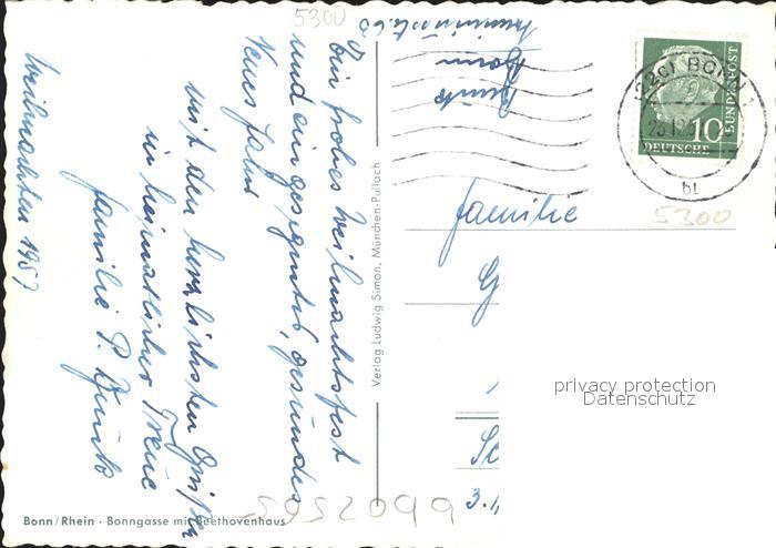 72016090 alte Postkarte Bonn Rhein Bonngasse mit Beethovenhaus postalisch gelaufen Erhaltung siehe scans KatCode: 11110005314000