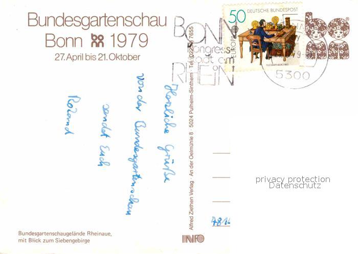 72824504 alte Postkarte Bonn Rhein Bundesgartenschau 1979 Rheinaue Siebengebirge Fliegeraufnahme postalisch gelaufen Erhaltung siehe scans [FriedD77] KatCode: 11110005314000