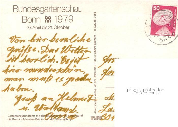 73762159 alte Postkarte Bonn Rhein Bundesgartenschau Rundfahrt Blumenbahn Konrad Adenauer Bruecke Siebengebirge Glockenhuegel postalisch gelaufen Erhaltung siehe scans [FriedD77] KatCode: 11110005314000