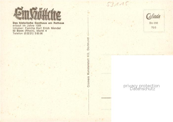 73866835 Bonn Rhein Em Hoettche Historisches Gasthaus am Rathaus Gastraum postalisch nicht gelaufen Erhaltung siehe scans [FriedD77] KatCode: 11110005314000