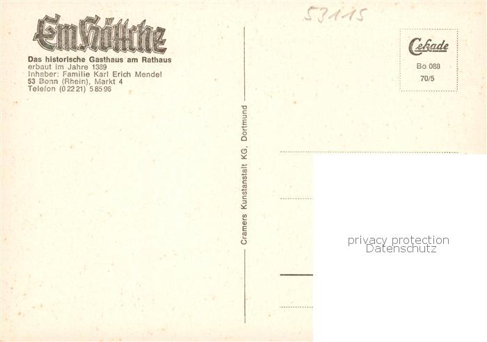 73866836 Bonn Rhein Em Hoettche Historisches Gasthaus am Rathaus Gastraum postalisch nicht gelaufen Erhaltung siehe scans [FriedD77] KatCode: 11110005314000