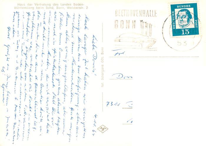 73892231 alte Postkarte Bonn Rhein Haus der Vertretung des Landes BW beim Bund postalisch gelaufen Erhaltung siehe scans [FriedD77] KatCode: 11110005314000