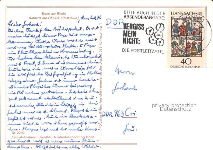 72455145 alte Postkarte Bonn Rhein Rathaus Obelisk Pestsaeule postalisch gelaufen Erhaltung siehe scans KatCode: 11110005314000