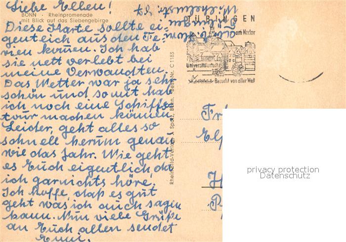 73609023 alte Postkarte Bonn Rhein Rheinpromenade mit Siebengebirge Ausflugsschiffe postalisch gelaufen Erhaltung siehe scans [WerneD78] KatCode: 11110005314000
