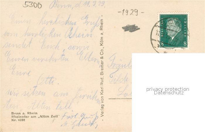 73698165 alte Postkarte Bonn Rhein Rheinufer am Alten Zoll postalisch gelaufen Erhaltung siehe scans [FriedD77] KatCode: 11110005314000
