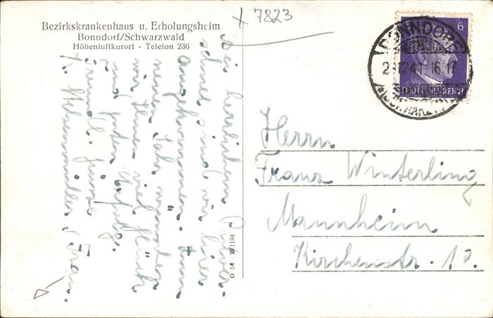 41394158 alte Postkarte Bonndorf Schwarzwald Bezirkskrankenhaus postalisch gelaufen KatCode: 11110008337022