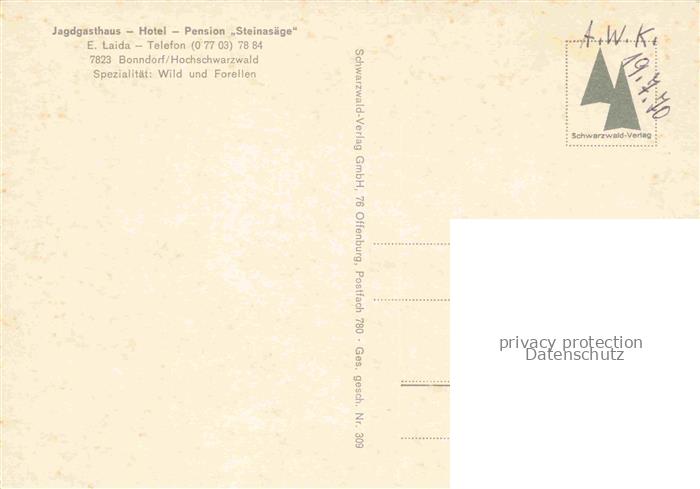 74153215 Bonndorf Schwarzwald BW Jagdgasthaus Hotel Steinasaege postalisch nicht gelaufen Erhaltung siehe scans [WerneD78] KatCode: 11110008337022