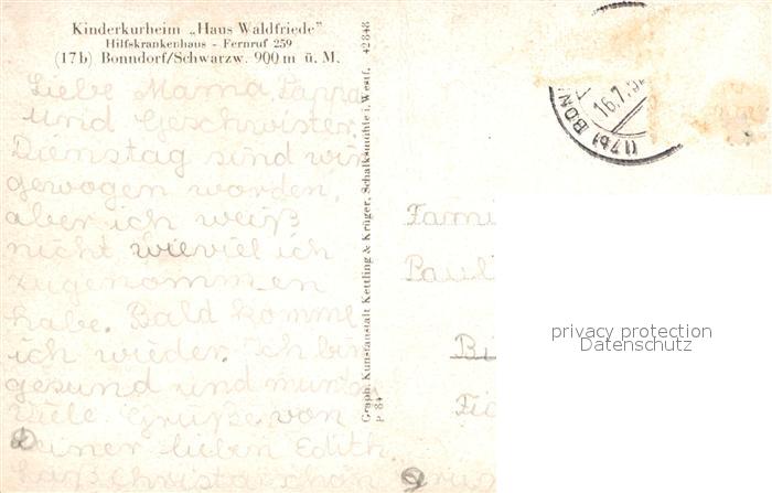 42965444 alte Postkarte Bonndorf Schwarzwald Kinderkurheim Haus Waldfriede Hilfskrankenhaus postalisch gelaufen Erhaltung siehe scans [KathaD81] KatCode: 11110008337022