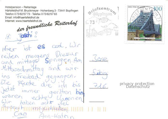 74043609 alte Postkarte Bopfingen Ipf Hotelpension Reitanlage Haertsfeldhof Ausritte Pferdekoppel postalisch gelaufen Erhaltung siehe scans [FriedD77] KatCode: 11110008136010