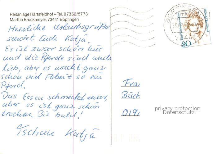 73725582 alte Postkarte Bopfingen Ipf Reitanlage Haertsfeldhof Gaestezimmer Pferdekoppel Ausritt postalisch gelaufen Erhaltung siehe scans [FriedD77] KatCode: 11110008136010