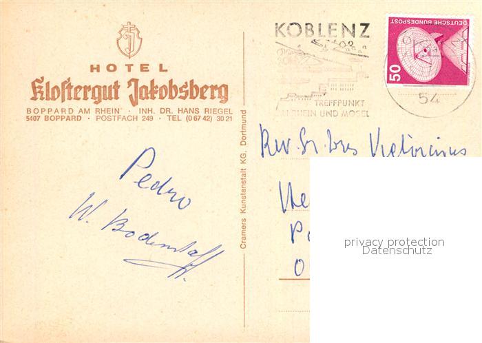 72934730 alte Postkarte Boppard Rhein Hotel Klostergut Jakobsberg postalisch gelaufen Erhaltung siehe scans [FriedD77] KatCode: 11110007140501