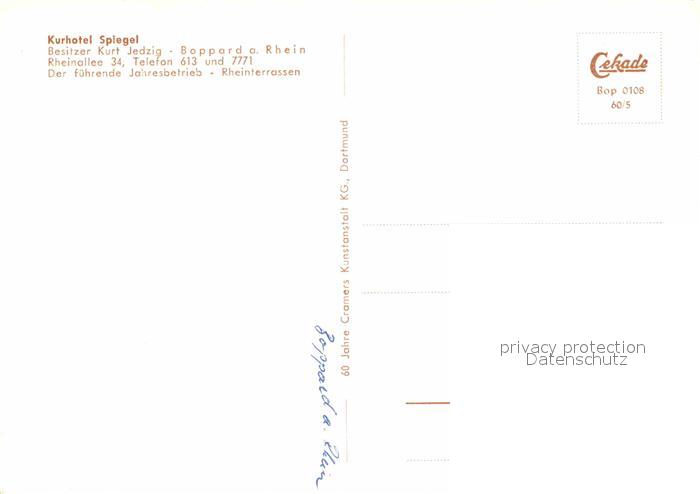 72724188 Boppard Rhein Rheinterrassen Kurhotel Spiegel Frachtkahn Faehre postalisch nicht gelaufen Erhaltung siehe scans [FriedD77] KatCode: 11110007140501