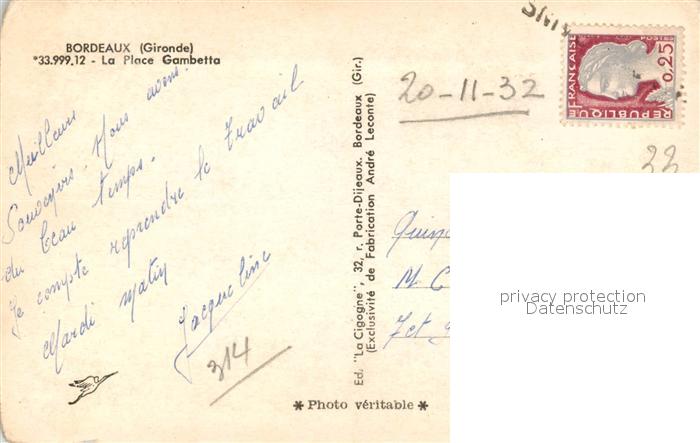13572476 carte postale Bordeaux La Place Gambetta postalisch gelaufen Erhaltung siehe scans [WerneD78] KatCode: 11170033233063