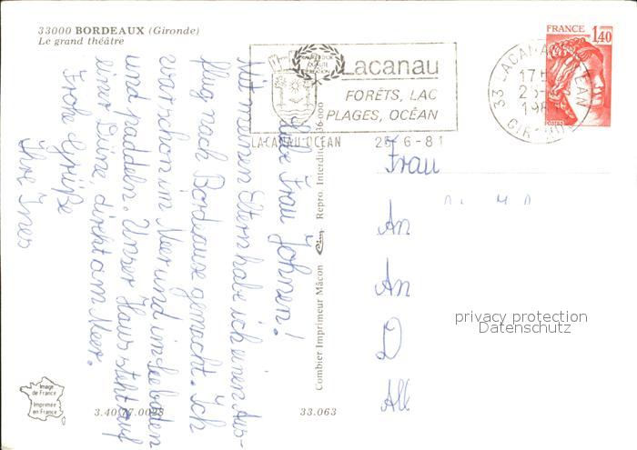 12310559 carte postale Bordeaux Le grand theatre postalisch gelaufen Erhaltung siehe scans KatCode: 11170033233063