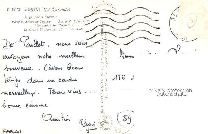 13504452 carte postale Bordeaux Place et Allees de Tourny Pont de Pierre Monument des Girondins Grand Theatre La Rade postalisch gelaufen Erhaltung siehe scans [WerneD78] KatCode: 11170033233063