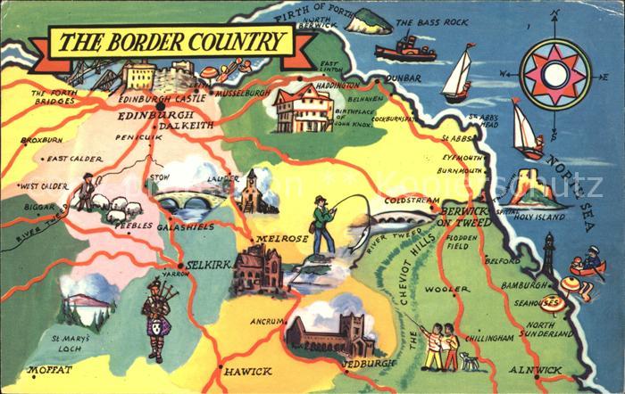 old postcard Border Country uebersichtskarte Sehenswuerdigkeiten postalisch gelaufen Erhaltung siehe scans