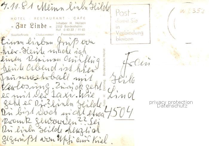 73115286 alte Postkarte Bordesholm Hotel Zur Linde postalisch gelaufen Erhaltung siehe scans [NatalD47] KatCode: 11110001058022