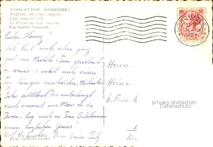 old postcard Bordighera Felsenriff postalisch gelaufen Erhaltung siehe scans