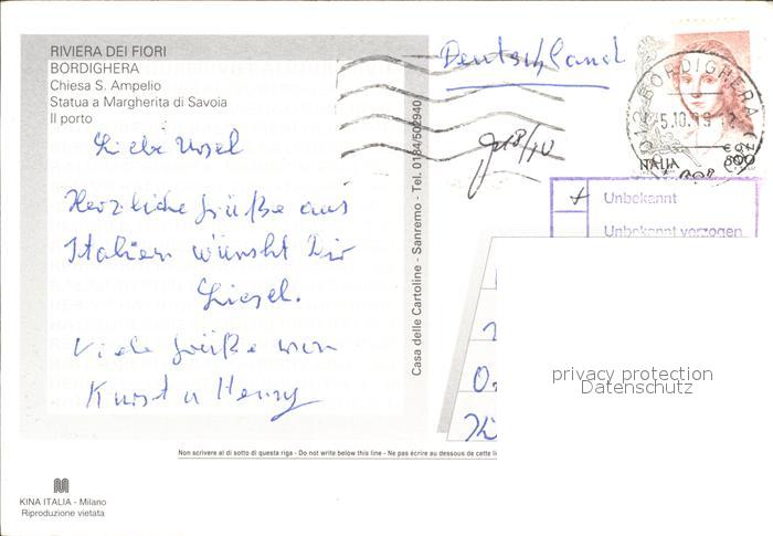 old postcard Bordighera Hafen Statua Margherita di Savoia Chiesa S. Ampelio postalisch gelaufen Erhaltung siehe scans