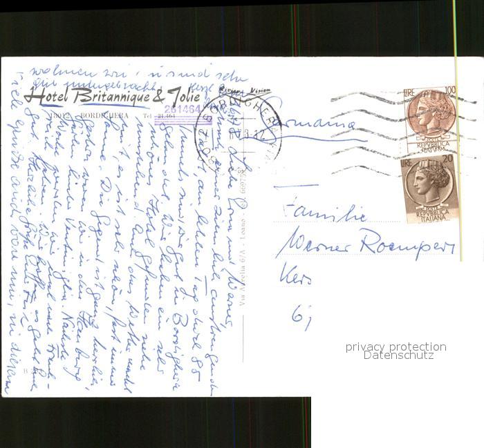 old postcard Bordighera Hotel Britannique & Jolie postalisch gelaufen Erhaltung siehe scans