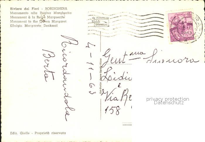 old postcard Bordighera Koenigin Margarete Denkmal postalisch gelaufen Erhaltung siehe scans