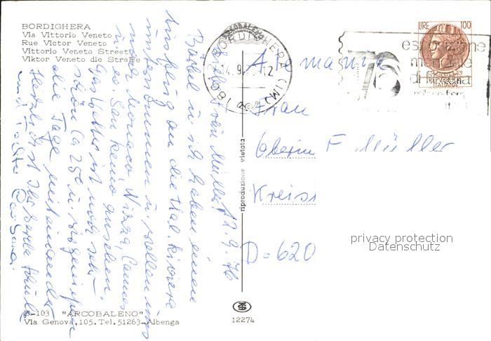old postcard Bordighera Via Vittorio Veneto postalisch gelaufen Erhaltung siehe scans