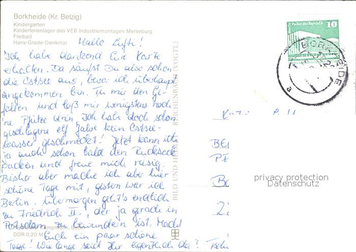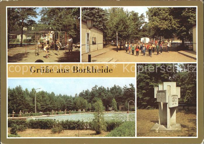 72016123 alte Postkarte Borkheide Kindergarten Schwimmbad Hans-Grade-Denkmal postalisch gelaufen Erhaltung siehe scans KatCode: 11110012069052