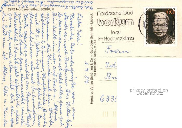 73159395 alte Postkarte Borkum Blick vom Leuchtturm Yachthafen Bismarckstrasse Strand Heimatmuseum Strandstrasse Abendsonne am Meer postalisch gelaufen Erhaltung siehe scans [FriedD77] KatCode: 11110003457002