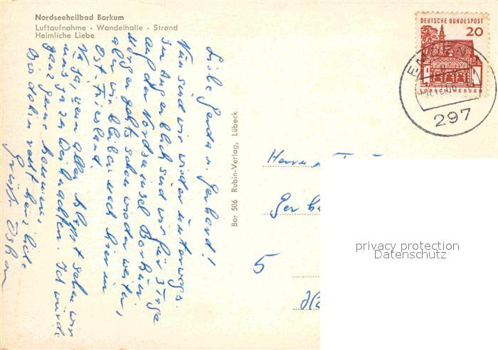 72850530 alte Postkarte BORKUM Nordseebad Niedersachsen Fliegeraufnahme Strand Wandelhalle Heimliche Liebe postalisch gelaufen Erhaltung siehe scans [LiesaD40] KatCode: 11110003457002